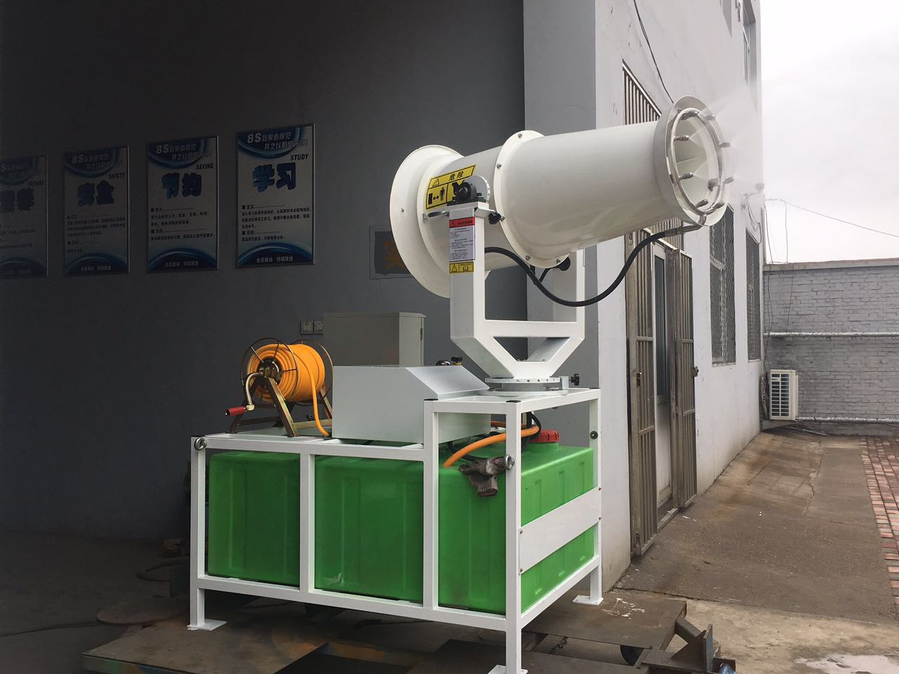 霧炮機(jī)的原理是灰塵可以通過(guò)與水結(jié)合而聚集和增加,使得細(xì)小的灰塵通過(guò)相等直徑的水滴的小胡作用,降低水面的張力,并使灰塵顆粒和水霧凝聚成一團(tuán),在重力額作用下,它落到了地面,當(dāng)霧粒接近顆粒大小時(shí),減塵效果 ,噴霧器通過(guò)高壓泵對(duì)水加壓,一定壓力的高壓水通過(guò)高壓霧化噴嘴產(chǎn)生直徑接近塵粒的水霧,通過(guò)大功率風(fēng)扇將水霧送到除塵區(qū)域,制成水霧和霧氣,灰塵顆粒迅速附和凝結(jié),在自身重力下沉降,達(dá)到降塵的目的,還具有加濕和冷卻功能。