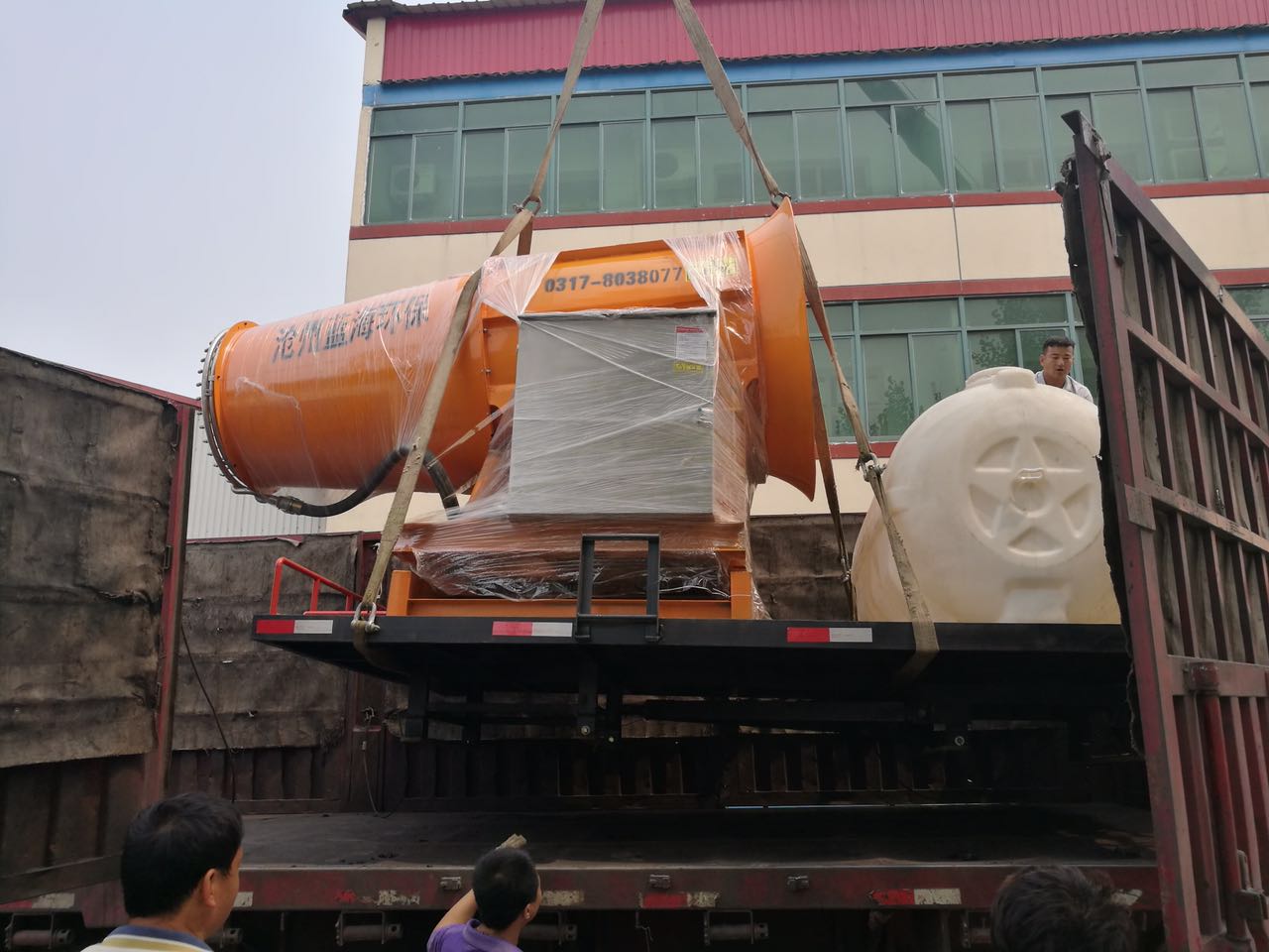 100米射程除塵噴霧機是我公司生產的較大型號的除塵噴霧機之一,自重2.3噸,風機長度接近3米,這種高射程的大型設備有時候裝車也是一件很費勁的事,由于體積較大,一般車間吊裝很難完成因此這種大型設備裝車一般使用大型吊車裝車, 近大射程除塵噴霧機一直在出貨,很多揚塵企業也在不斷的 新除塵噴霧機,從小型號到大型號發展。